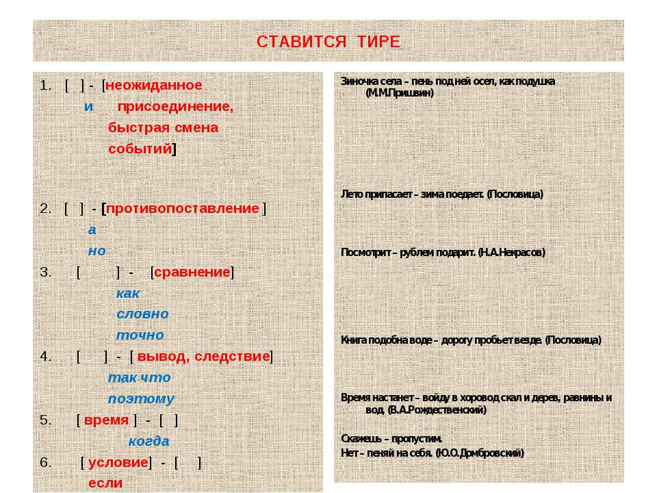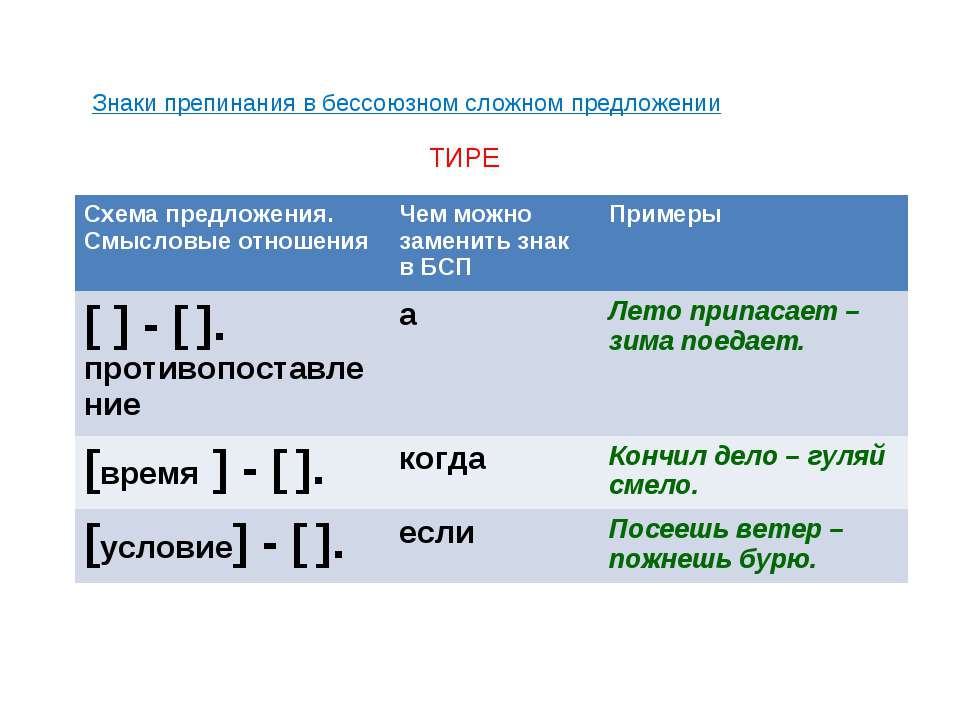 | Тире | Части БСП противопоставлены по смыслу | а, но | Весна сажает – осень собирает. |