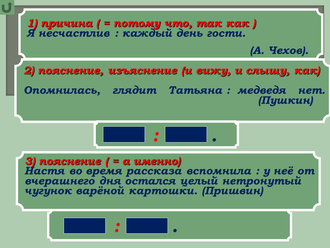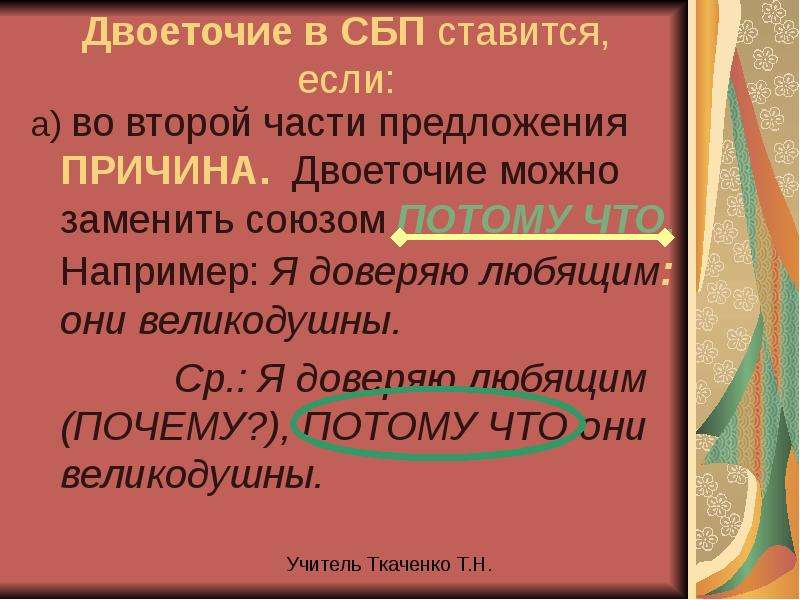 | Двоеточие | Второе предложение имеет значение причины | потому что | Ане пришлось отвлечься от работы: в дверь позвонили.