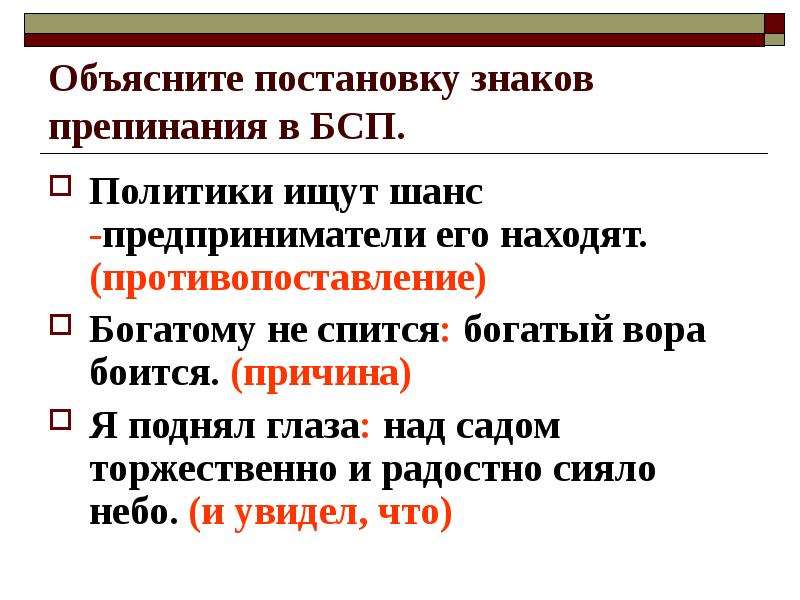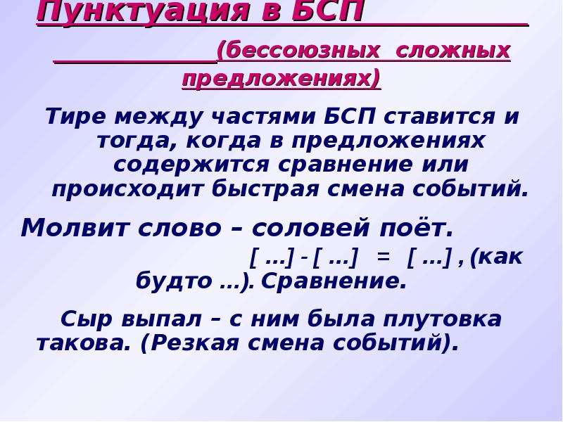 | Запятая | Части БСП связаны отношением перечисления (одновременности или последовательности) | и | Во дворе стояла большая будка, возле нее дремал хозяйский пес. |