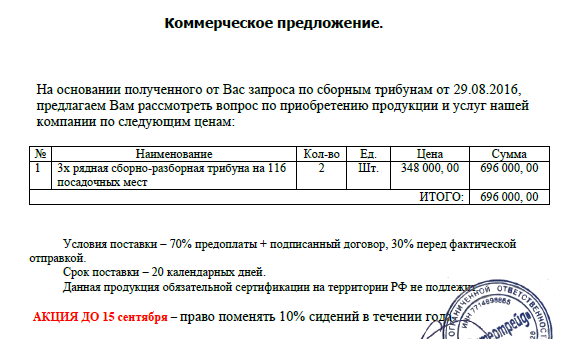 Дополнительно могут использоваться блоки: о компании, нам доверяют, спецпредложение, наша команда, схема работы, блок усиления спроса. Наверняка вам интересно, как выглядит такое коммерческое предложение — образец можно скачать здесь.