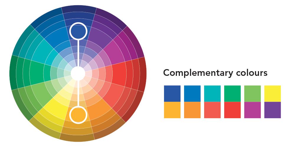 В основе теории цвета дополнительные цвета — это противоположные оттенки на цветовом круге. В своей самой простой форме они представляют собой один основной цвет и вторичный цвет, который создается путем смешивания двух других основных цветов. Например, дополнительный цвет к желтому — фиолетовый, представляющий собой смесь синего и красного.