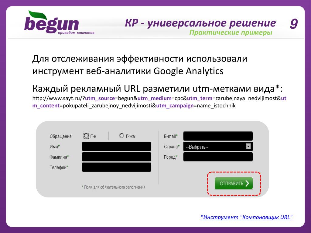 Инструменты для создания UTM -метокПри добавлении всех параметров, получается довольно длинный URL. Для автоматической генерации нового URL, можно воспользоваться инструментом под названием Компоновщик URL от Google.