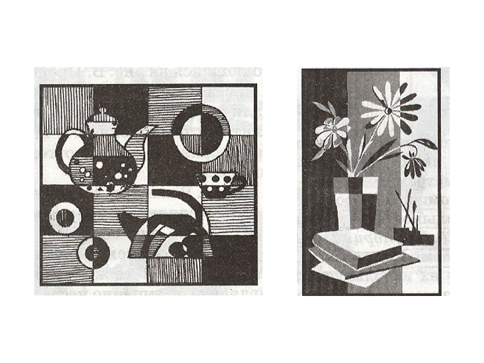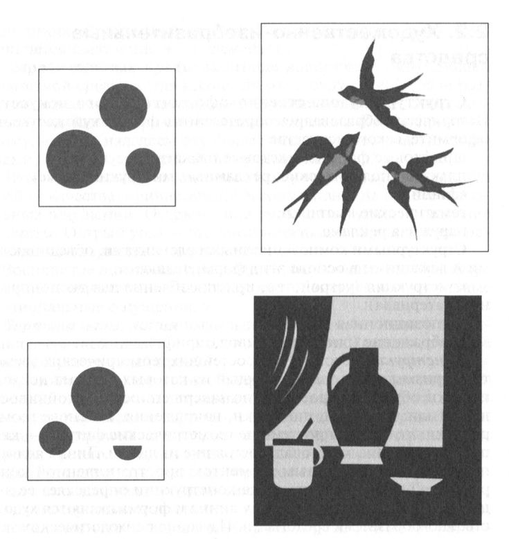 Силуэтные композиции подчиняют интерес внутри группы интересу к контрастным краям и контурам, часто с использованием обмена значениями. Силуэт придает особое значение рисунку 9.0003