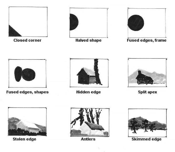 Другие возможности: крестообразные, горизонтальные, вертикальные, консольные, перекрывающиеся рамки (шахматная?), кривые/органические/круглые, созвездия (визуально связанные точки с ритмом), блуждание [Митай], золотое сечение
