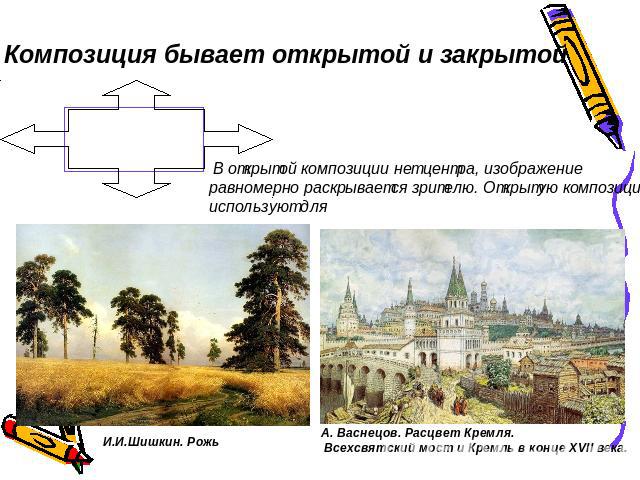 Открытая композиция, в которой направления линий исходят от центра, дает нам возможность продолжить мысленно картину и увести ее за рамки плоскости. Она подходит для передачи открытого пространства, движения.
