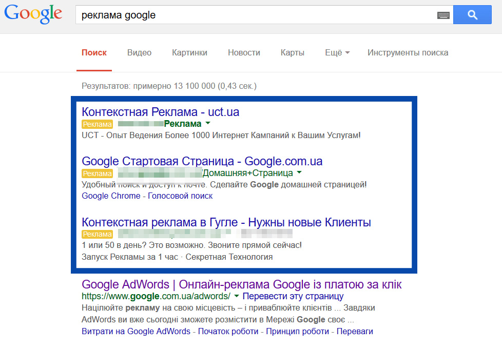 Пример: пользователь вводит в поисковую строку Google запрос «изучение английского». В результатах поиска получает несколько рекламных объявлений от языковых школ, разместивших рекламу.
