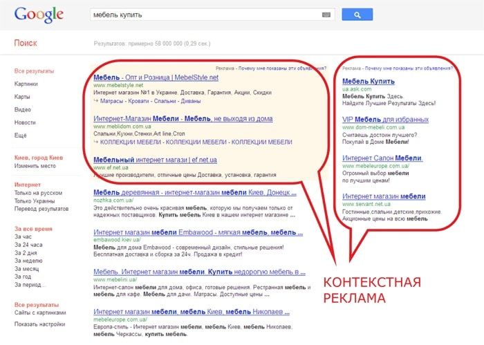 Поисковая контекстная реклама показывается перед результатами поиска в Google, Яндекс, Mail.