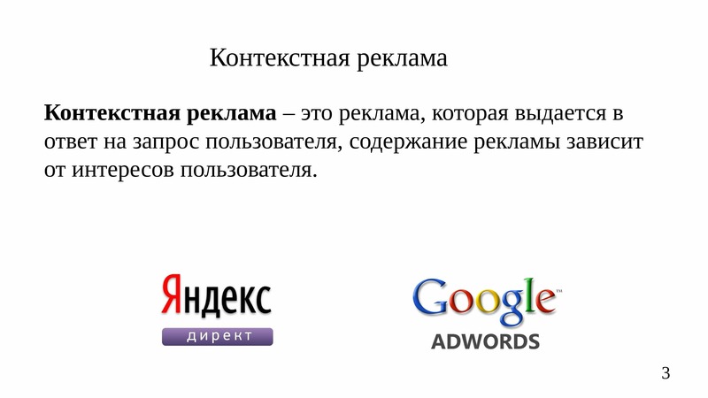 Контекстная реклама — это текстовые и текстово-графические рекламные блоки, которые показывают интернет-пользователям на основании их поисковых запросов, интересов и поведения в Интернете. Целевая аудитория может увидеть контекстную рекламу в результатах поиска, на сайтах, в приложениях, в интернет-сервисах и на других ресурсах. Преимущество контекстной рекламы — ориентированность на интересы целевой аудитории.