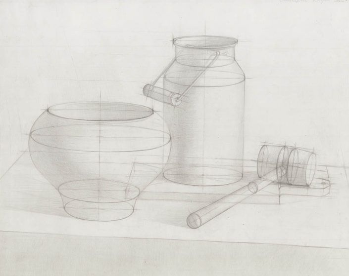Академический рисунок натюрморт карандашом начинается с размещения композиции на листе бумаги. Прежде всего ученик должен найти наиболее выгодный ракурс, определиться с объемами и пропорциями, и лишь после этого приступать к легкому нанесению набросков.