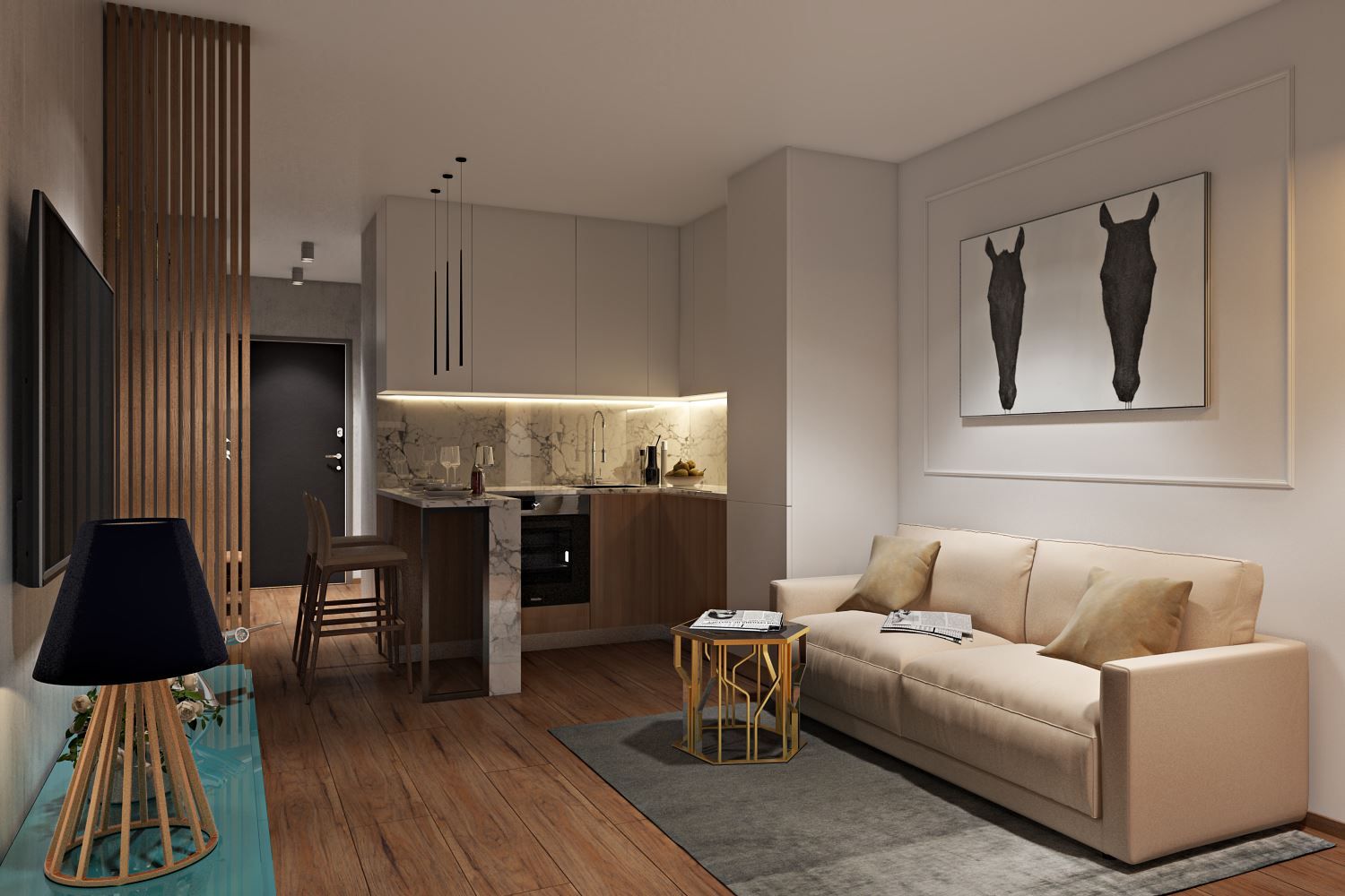 Если спальню с точки зрения философии SMART-квартир необходимо размещать в отдельном помещении, то гостиную, кухню и столовую можно комфортно объединить в одном пространстве по принципу студии, выделив в нем соответствующие функциональные зоны.
