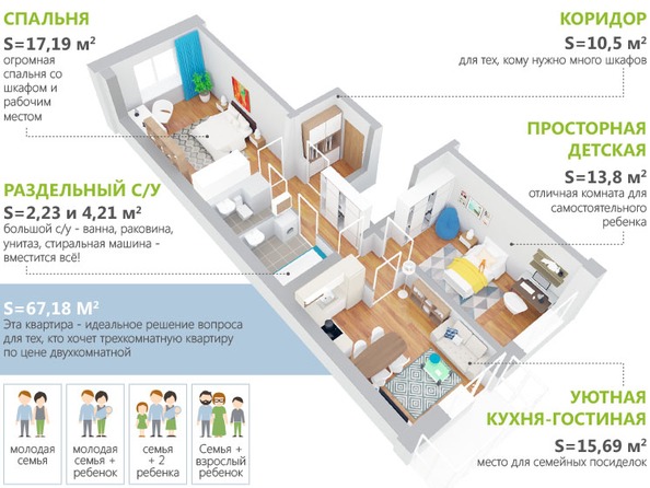 SMART-квартиры различных типов, планировочные решения, площадь, набор помещений и количество спален продумываются нашими архитекторами под потребности основных типов семьи: супружеских пар, семей с одним ребенком или двумя детьми, с пожилыми людьми.