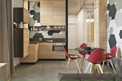 Размещение кухонного гарнитура и холодильника не требует большой площади. Поэтому зона кухни SMART-квартир всегда компактна и функциональна.