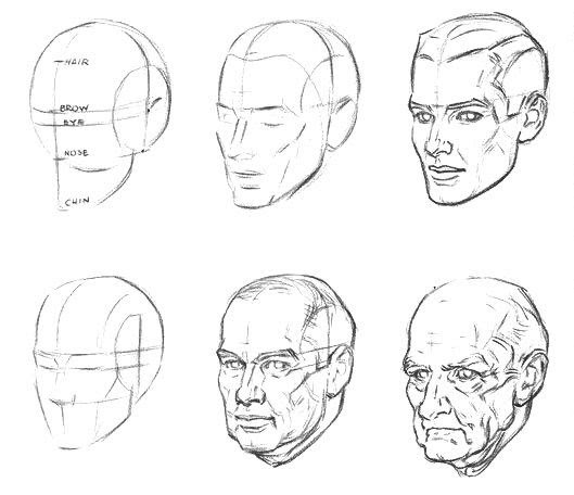 В основе головы тут находятся два круга, если смотреть в профиль. В анфас это два пересекающихся овала. Вспомогательные линии везде на одном уровне. Как бы лицо не повернулось.