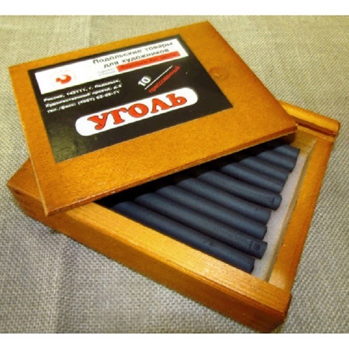 Уголь – тоже по сути модификация углерода. Получается путём сжигания древесины. Этот материал мягче графита, но вместе с тем, оставляет более контрастный след на бумаге. В продаже можно встретить уголь в виде простых пережженных веточек, либо спрессованным в деревянный корпус (выглядит как карандаш).