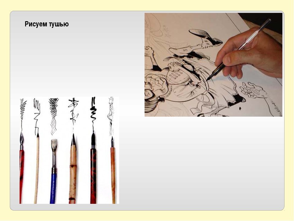 Раньше рисование тушью и пером было популярно у плакатистов. Специальной формы металлические перья позволяли выводить каллиграфическую вязь и украшать работы красивыми вензелями. Сегодня рисование пером менее популярно. Впрочем, каллиграфия вновь завоёвывает сердца художников.