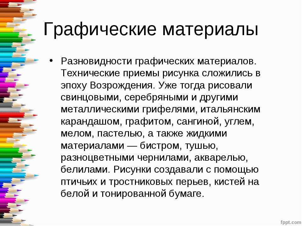 Это лишь несколько основных видов графических материалов. Пробуйте, совершенствуйте своё мастерство и помните: чем больше вы рисуете, тем лучше у вас получается.