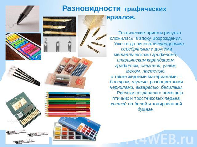 К графическим техникам относятся: графитный, цветной или «итальянский» карандаш, пастель, восковые мелки, фломастеры и др. рисующие материалы; также тушь, перо, палочка; реже — акварель, гуашь, те. техники, которые многие «музейщики» и реставраторы относят к графическим.