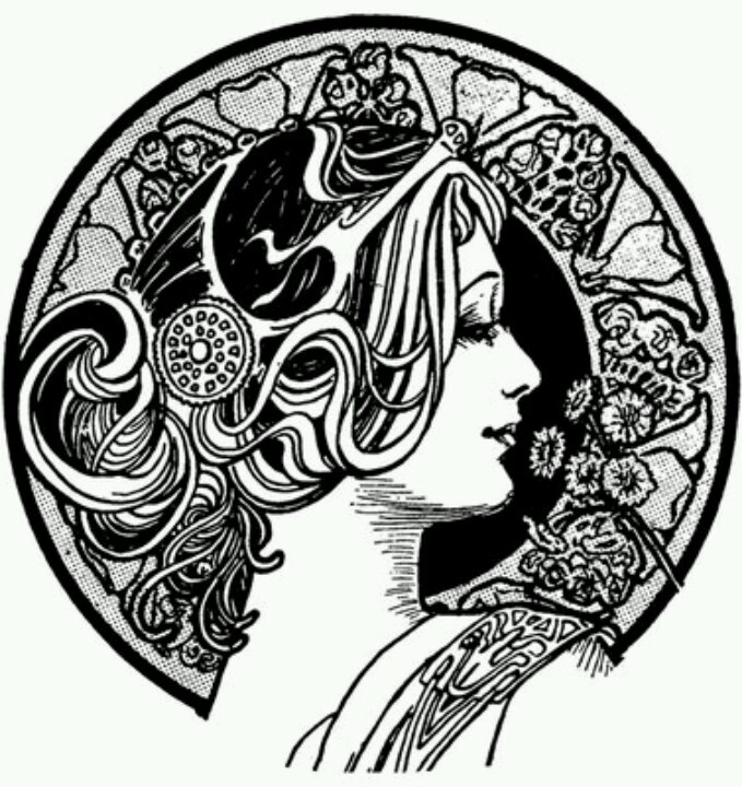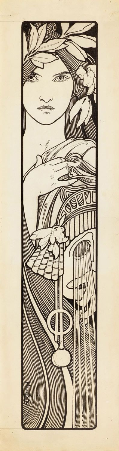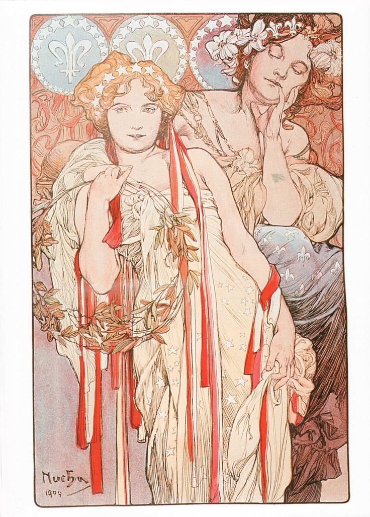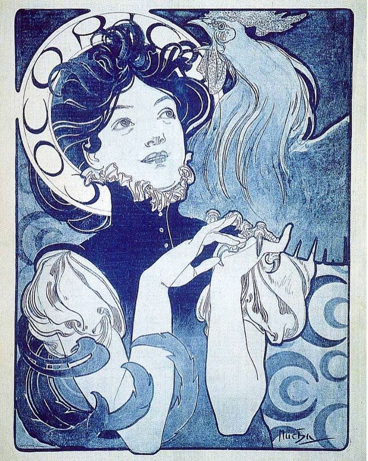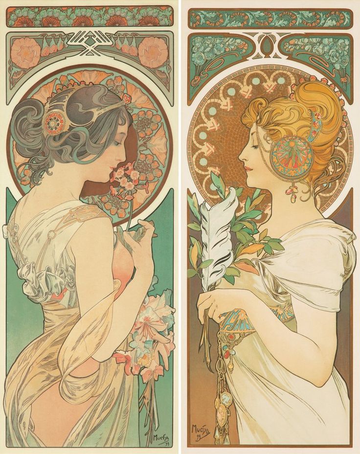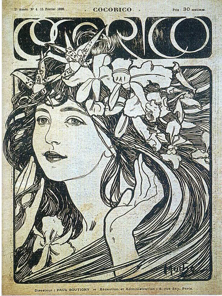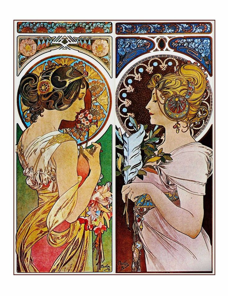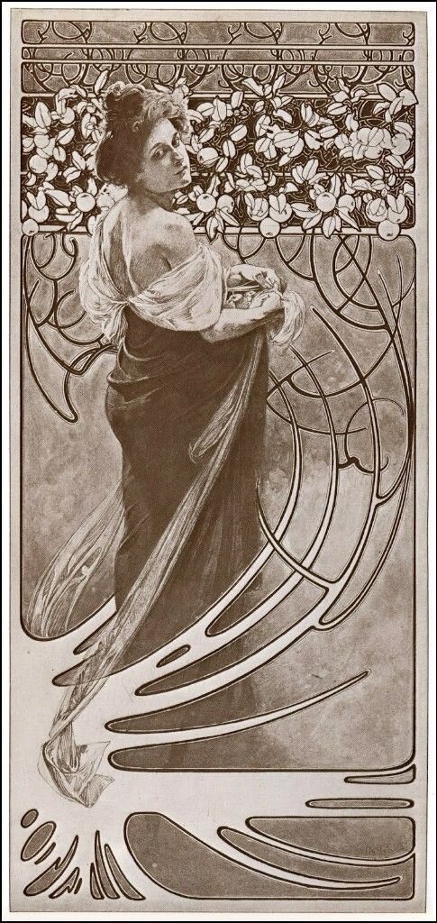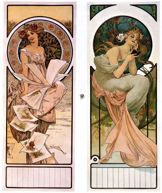 Альфонс Муха, молодой чешский художник, работавший в Париже, по праву считается графическим дизайнером, который привел стиль ар-нуво к своему высочайшему визуальному выражению. Начиная с 1890-х годов он создавал проекты, в которых, как правило, изображались красивые молодые женщины, чьи волосы и одежда кружатся в ритмичных узорах, — которые достигли идеализированного совершенства.