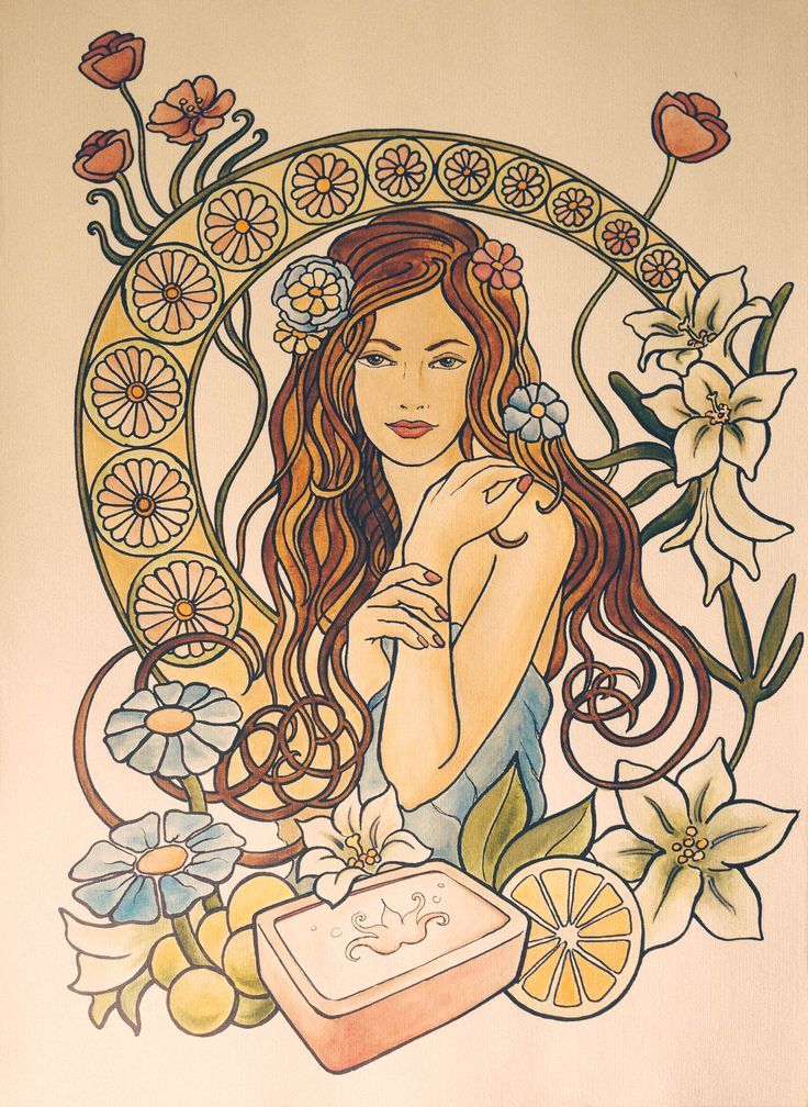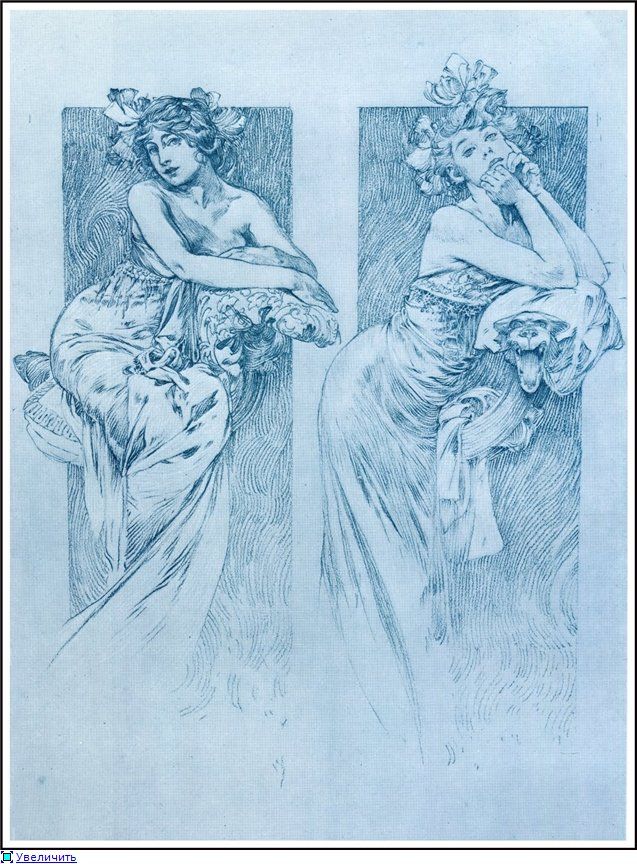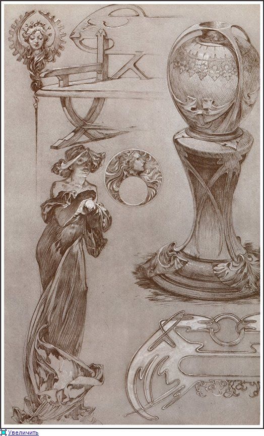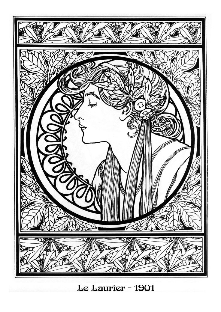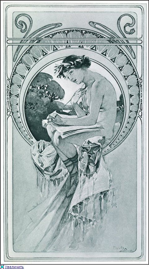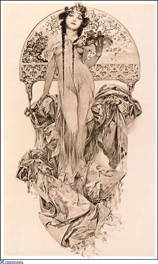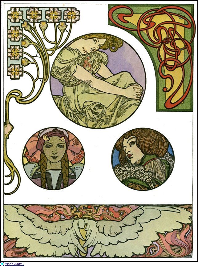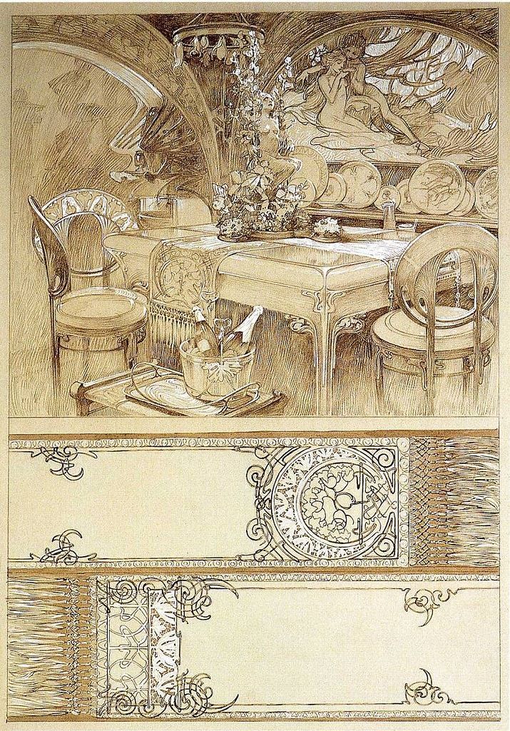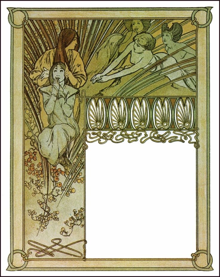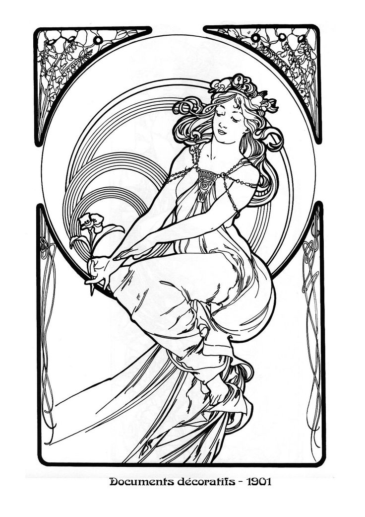 Альфонс Муха, молодой чешский художник, работавший в Париже, по праву считается графическим дизайнером, который привел стиль ар-нуво к своему высочайшему визуальному выражению. Начиная с 1890-х годов он создавал проекты, в которых, как правило, изображались красивые молодые женщины, чьи волосы и одежда кружатся в ритмичных узорах, — которые достигли идеализированного совершенства.