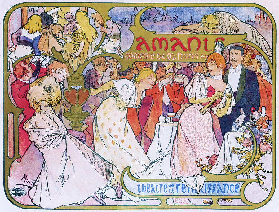 Еще одним вектором массового признания ар-нуво стал графический дизайн. С появлением цветной литографии в 179 г.8, цветные плакаты получили более широкое распространение в рекламе. Это совпало с появлением розничных универмагов. Художники разработали эти плакаты в стиле ар-нуво, в основном изображая гламурных женщин в окружении цветов. Обложки книг и журнальные иллюстрации должны были привлекать и удерживать взгляд читателей замысловатыми узорами, нарисованными жирными извилистыми линиями.