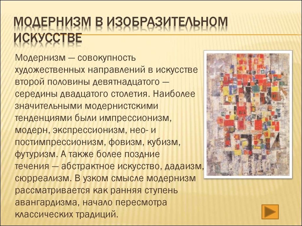Модернизм , в изобразительном искусстве разрыв с прошлым и одновременный поиск новых форм выражения.