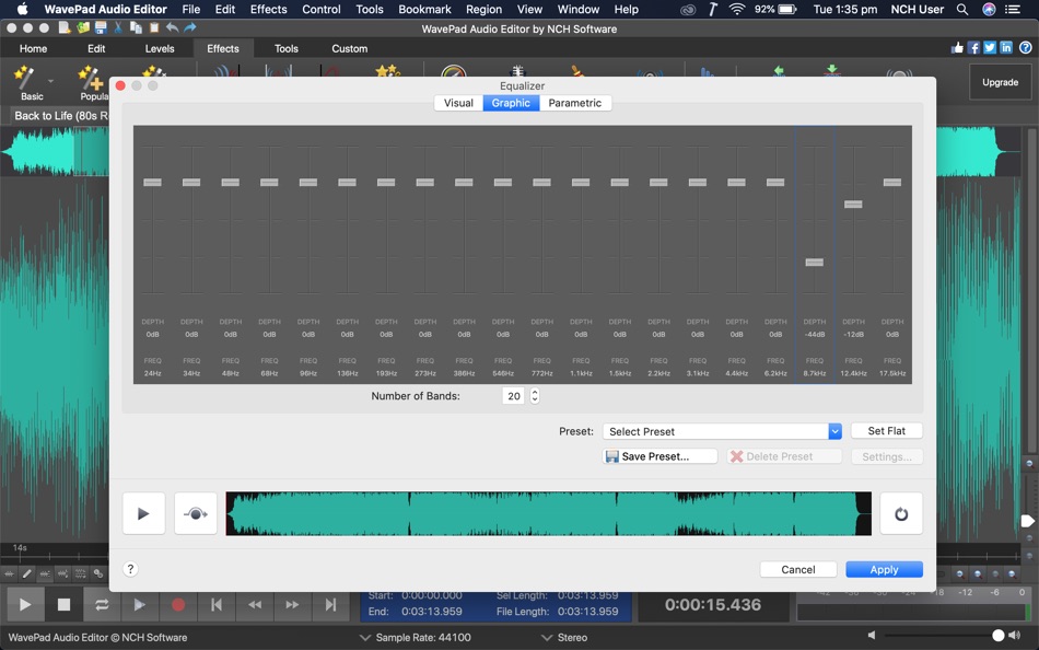 Вы можете усиливать, ослаблять и неограниченно формировать тона и частотные диапазоны и при этом работать с высокой точностью, используя нужные опции фильтров для отдельных полос эквалайзера. Продвинутые возможности редактирования звуковых дорожек в modernEQ помогут вам сформировать свой собственный уникальный звук для своего проекта.