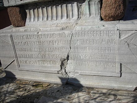 Одна надпись гласит: APRO ET MAXIMO CONSVLIBVS OFICINA MERCATI. В переводе это означает: «Во время консульства Апера и Максимуса». Апер и Максимус — консулы или дипломаты Римской империи в начала III века.