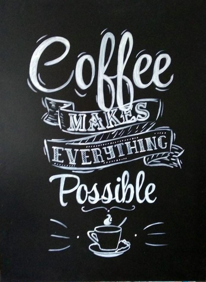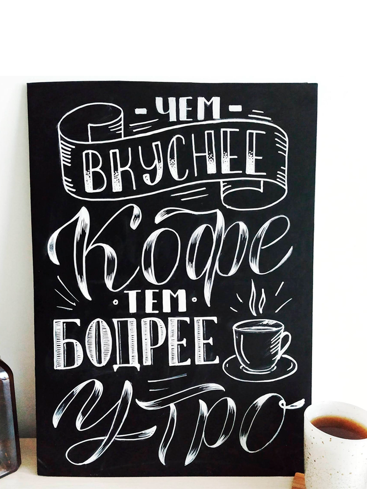 Часто меловые доски устанавливаются при входе в кафе для привлечения клиентов. Их оформление или меловой леттеринг — увлекательная техника, которая позволяет создавать шедевры, используя кусочек мела. Масштабное увлечение леттерингом началось 10 лет назад. Идея пришла к нам из европейских стран и блестяще вписалась в винтажный ажиотаж и повальное увлечение хэндмейдом.