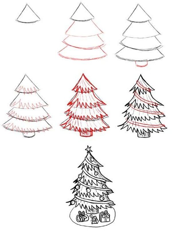 Можно начинать так, как внешне выглядит елка — треугольник, поэтапно добавляя ветки, делая елку все более и более пышной, а потом новогодние гирлянды, игрушки, подарки под елкой, как это представляется.