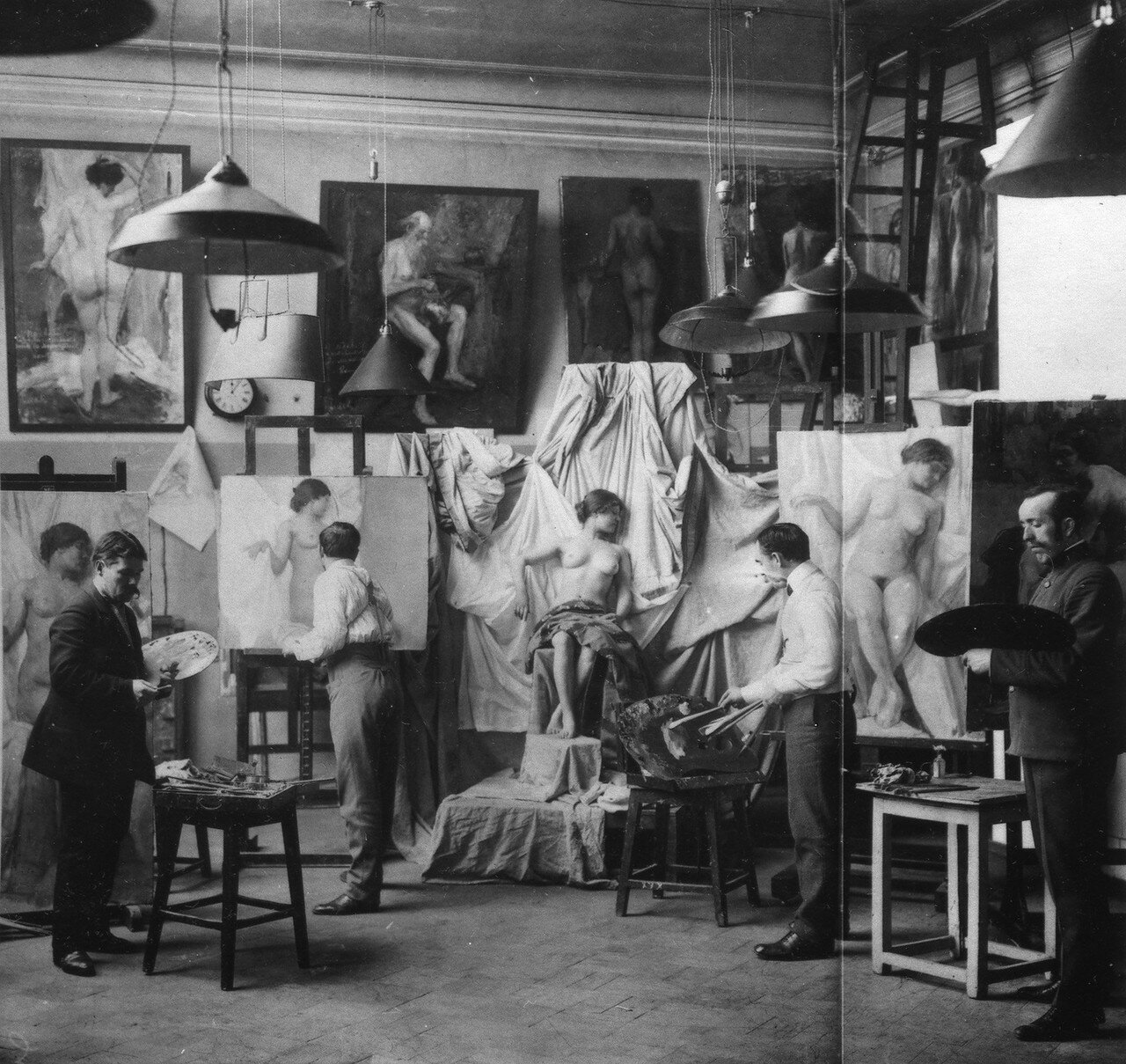 Старшие художники рисуют и смотрят друг на друга в художественной студии.