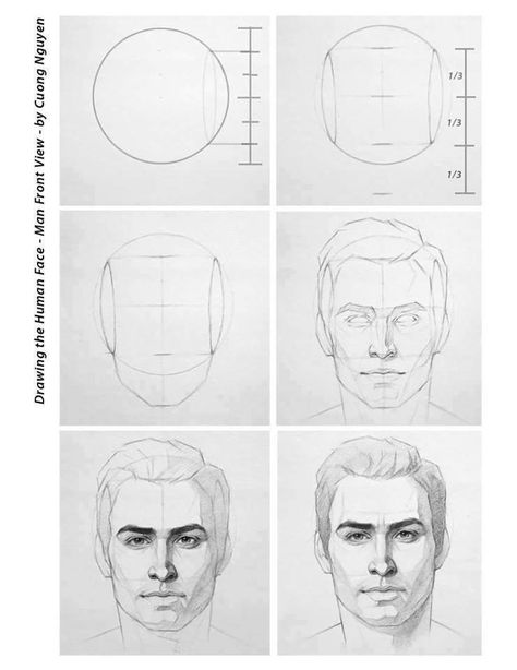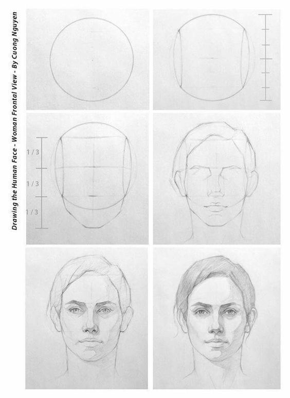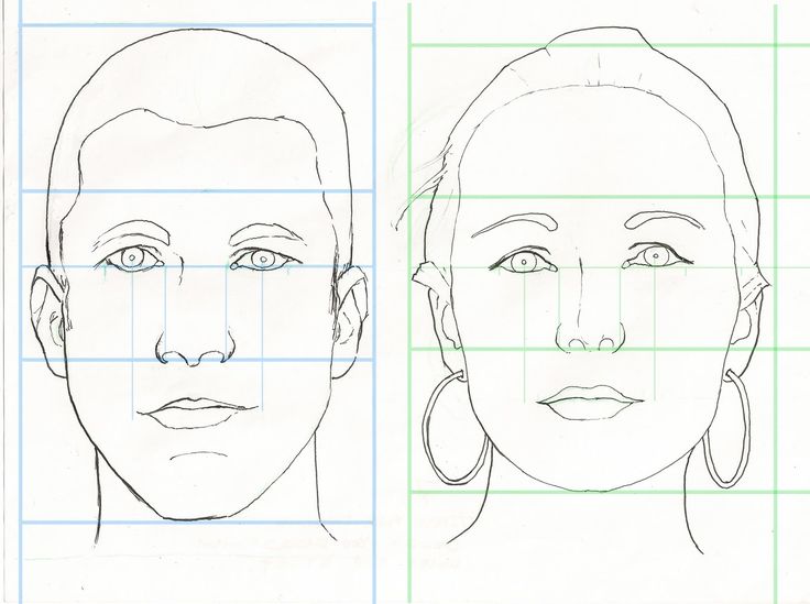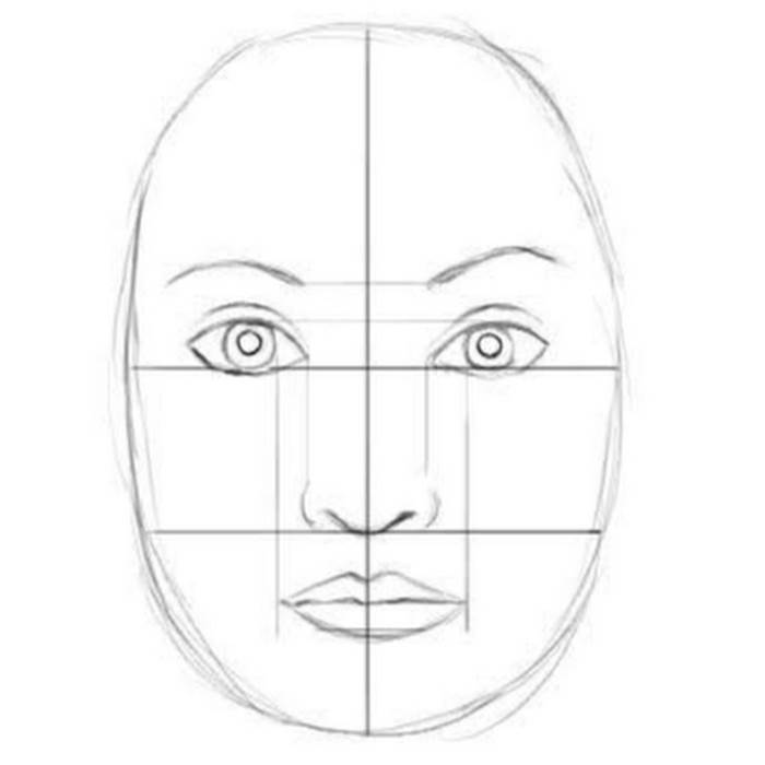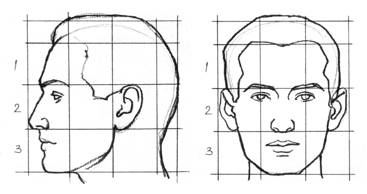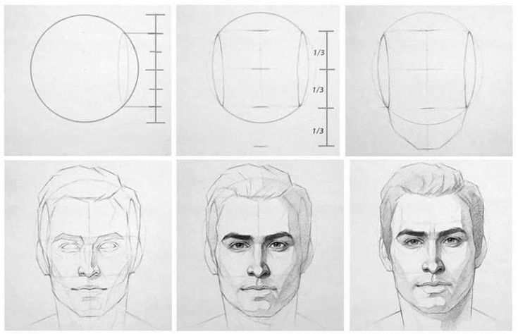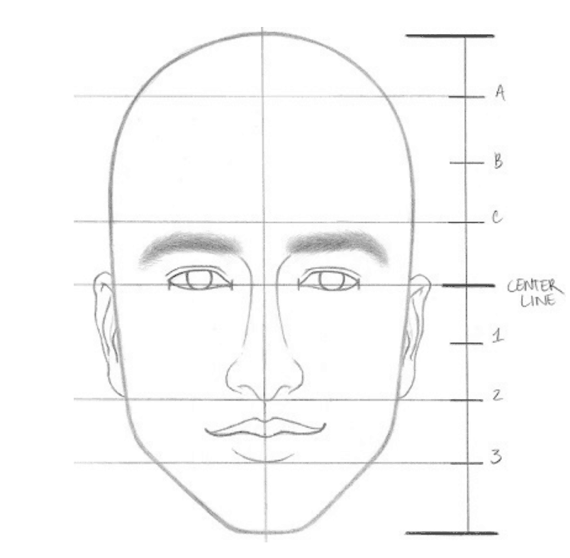 Теперь давайте обрисуем лицо. Начнем с наброска линии роста волос. Далее разделите область от линии роста волос до подбородка на 3 равные части. Первая часть – от начала роста волос до бровей. Вторая часть – от бровей до основания носа. Третья часть – от основания носа до подбородка. Как правило, эти три раздела одинаковы для всех людей. Также расстояние между секциями будет равно высоте уха, но об этом позже.