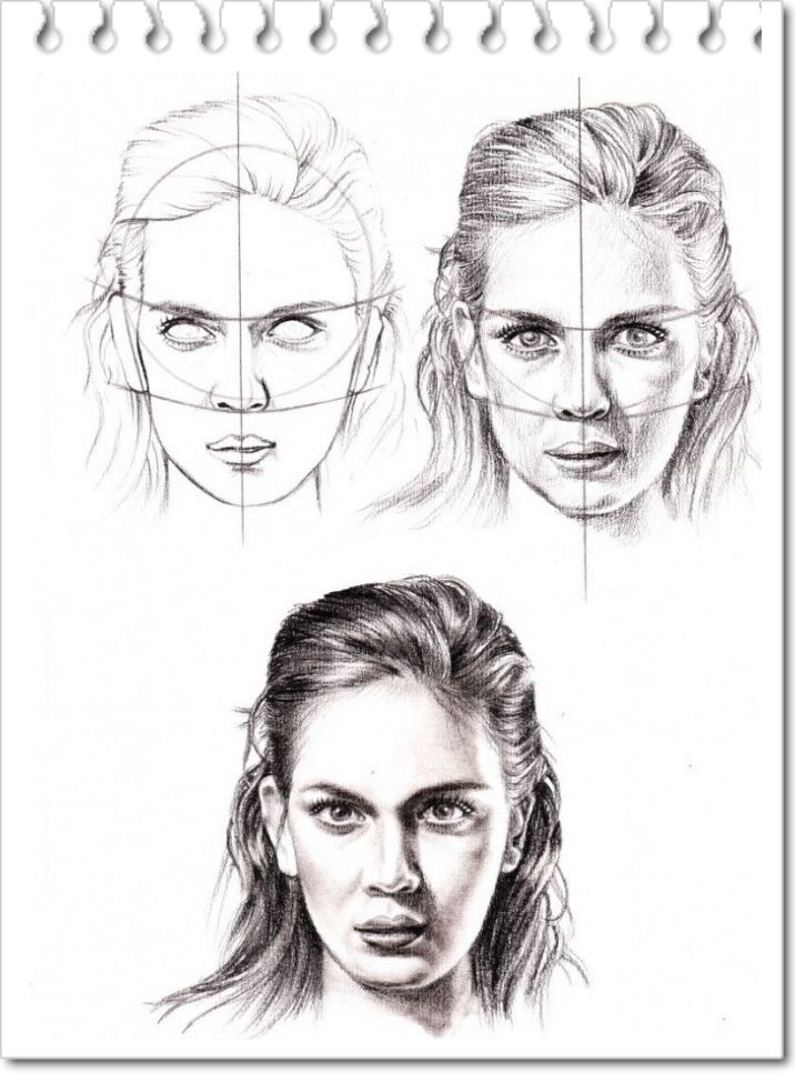 Примечание: Работа должна быть создана по системе от общего к частному. На начальных этапах не стоит слишком вдаваться в детали. Думайте масштабно. Не зацикливайтесь на том, как нарисовать глаз или нос. На данный момент мы просто определяем, где они должны быть расположены.
