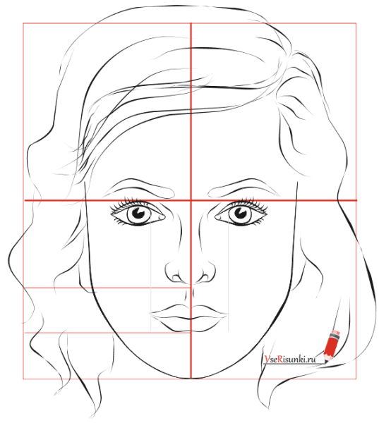 Давайте начнем добавлять детали к частям лица. Так как все части головы связаны между собой, рисовать необходимо все относительно друг друга. Если провести вертикальную линию от внутреннего уголка глаза к низу второй секции, то она будет равна ширине носа. Нарисуйте еще одну вертикальную линию от середины глаза до линии рта, чтобы получить ширину рта.