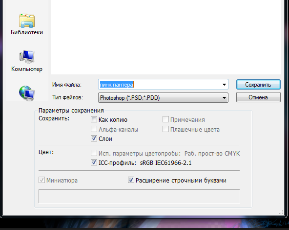 Процесс сохранения картинки тесно связан с форматами графических файлов. Поскольку от того, какой вы выберите формат, будет зависеть многое (поддержка прозрачности, размер файла и количество отображаемых цветов). Я не буду повторяться и расписывать о каждом формате, поскольку вся эта информация уже подробно изложена в статье, посвященной графическим форматам и расширениям, используемых фотошопом.