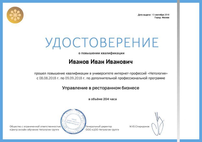 | Документы о прохождении курсов | Сертификат, Диплом |