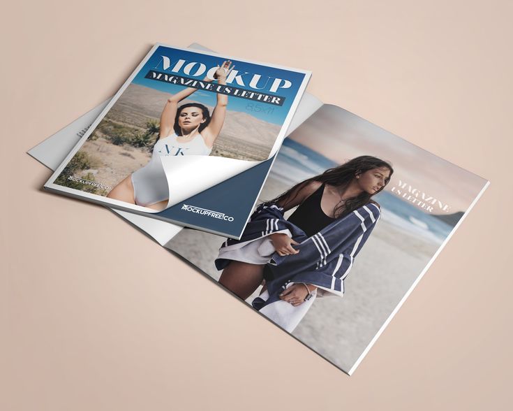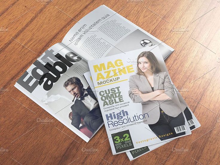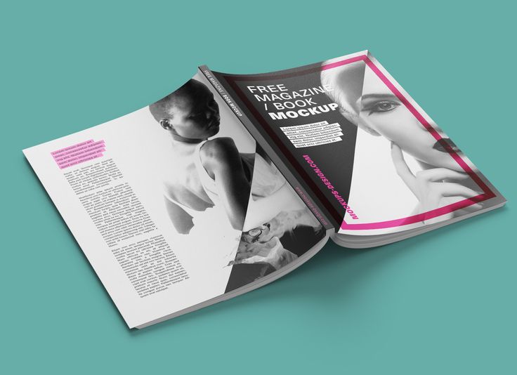 Этот качественный мокап — отличный выбор для тех, кто стремится к совершенству. Изображение представляет собой открытый журнал и обложку, чтобы можно было эффектно представить результат своей творческой работы. Добавить дизайн в мокап можно с помощью смарт-объектов. Процесс интуитивно понятен — вам понадобятся лишь базовые знания Photoshop.