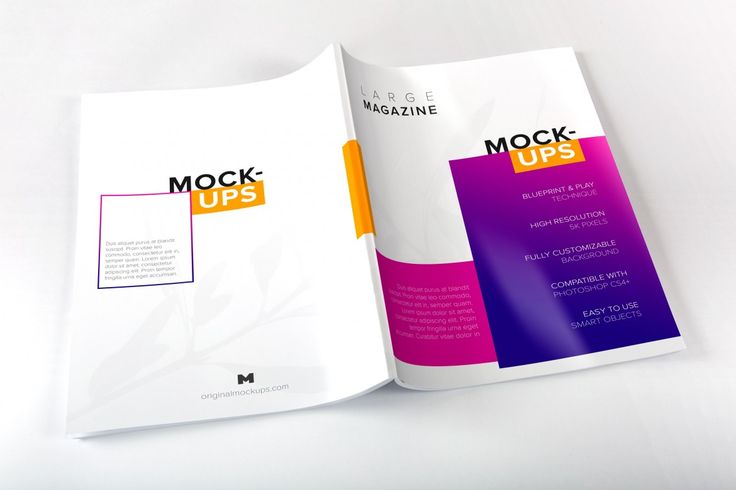 Мокап журнального разворота, который также можно использовать для презентации книги в мягком переплете или каталога. Добавьте дизайн страниц с помощью смарт-объектов, чтобы представить фирменный стиль, фотографии, иллюстрации. Кроме того, вы можете опубликовать соответствующее изображение в социальных сетях.