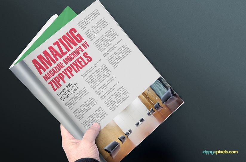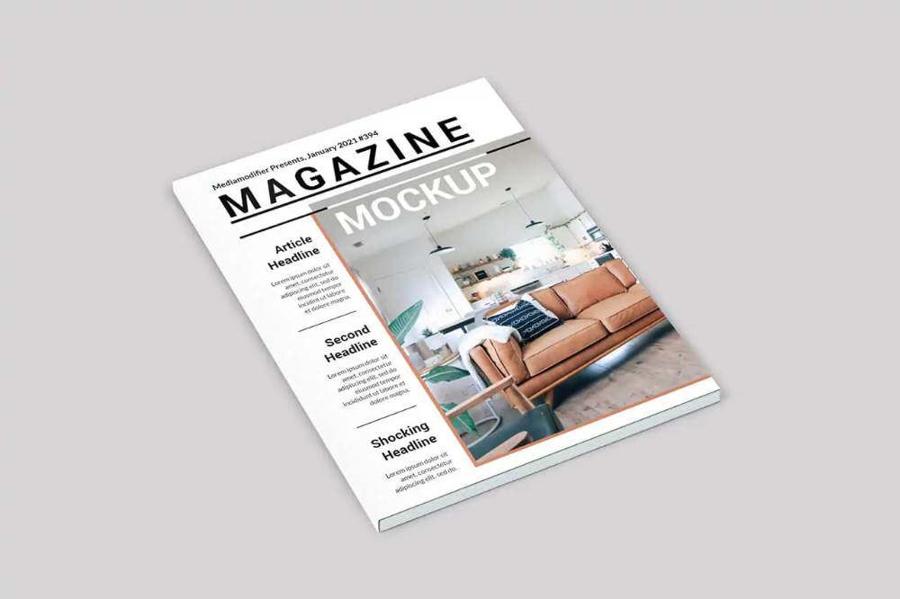 Взгляните на этот мокап журнала! В файле нет ни одного дополнительного декоративного элемента, лишь 3 трехмерных блока, поэтому ничто не будет отвлекать зрителей от самого контента.