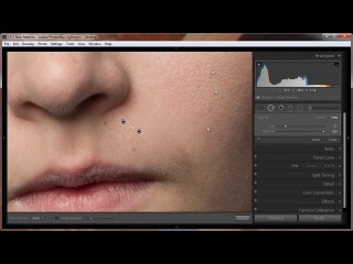 Коррекция формы в lightroom?Коррекция формы лица – задача, на первый взгляд, невыполнимая внутри Lightroom. Но мы попробуем. Во-первых, форма определяется светотеневым рисунком, который мы только что правили. Второй аспект проблемы – коррекция видимого на фотографии контура, то, что в фотошоп мы делали бы liquify filter. Все знают что в lightroom нет никакого liquify filter, но зато есть spot removal. Вот его и будем использовать.