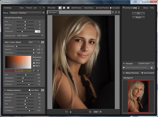 Красим кожу, избегая тех мест, где контраст должен сохранится. Это: глаза, губы, крылья носа хвост носа и сам контур лица. Кожа начинает выглядеть еще волшебнее чем была. Не возбраняется также поиграться с ползунком sharpness, подыскав значение, при котором, в наибольшей степени сохраняется естественная структура кожи. Где нибудь 20, в данном случае.