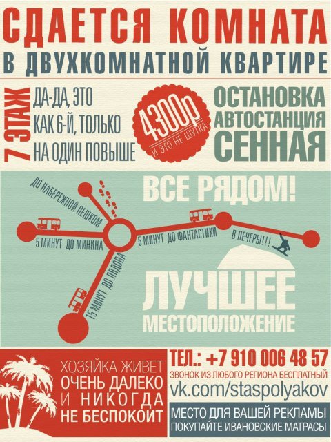 — Рисунок нам сделала двоюродная сестра. Она окончила художественную школу, — рассказал Иван. — Могу с уверенностью сказать, что такие объявления замечают. Нам по этому объявлению поступило больше десяти предложений, многие хвалили оформление, говорили, что именно оно привлекло. К сожалению, ни один из вариантов нас не устроил, и в итоге мы за $300 сняли 1-комнатную квартиру без мебели в Зеленом Луге через агентство недвижимости.