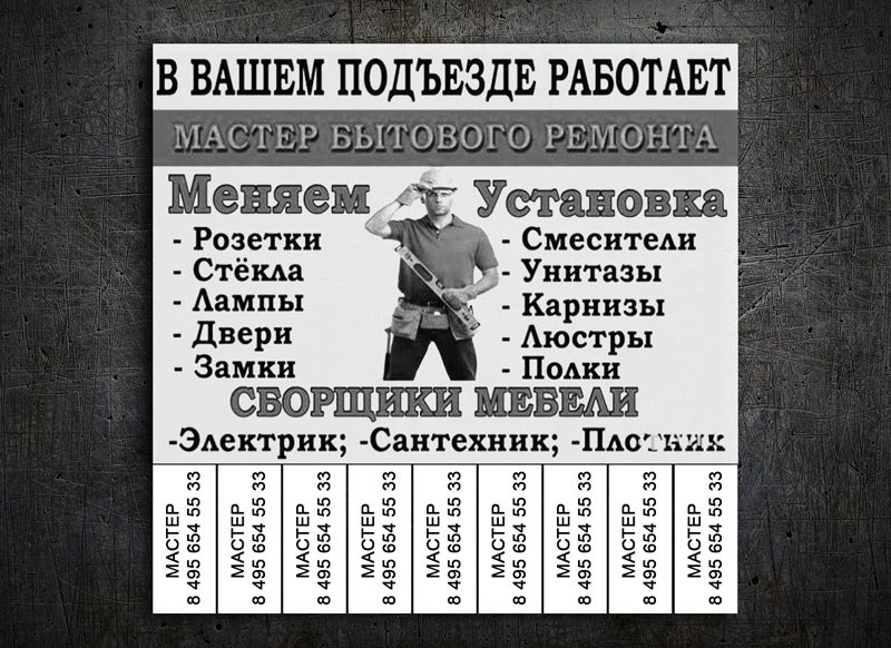 Для нас нет мелкой работы. Наш персонал трудится оперативно, знает «правильные» места расклейки объявлений (вариантов – много, эффективных – можно пересчитать по пальцам) и самые удачные часы для этой работы, проходит контроль проделанного труда, в полном объеме предоставляет отчетность и соблюдает законодательство.