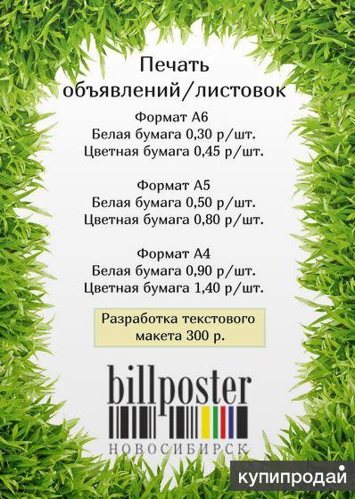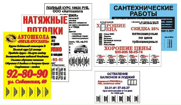 - Правильный выбор формата. Если вы планируете расклеивать рекламные объявления по остановкам, стоит выбрать формат А4 (стандартный альбомный лист) или А5 (1/2 листа). Если объявления будут расклеиваться в подъездах, идеальный формат – А6 (четверть стандартного листа).