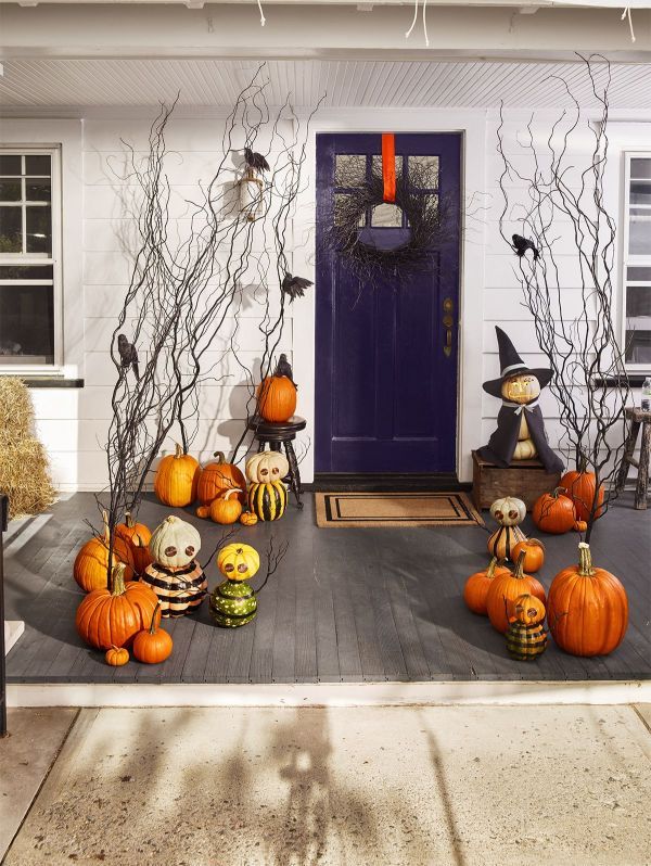 Не стоит забывать о входе в дом, ведь это будет первое, что увидят ваши гости. Если позволяет место, ведьминский уголок из прихожей можно перенести на крыльцо. Украсить дверь вырезанными из бумаги или купленными в магазине пауками, летучими мышами.