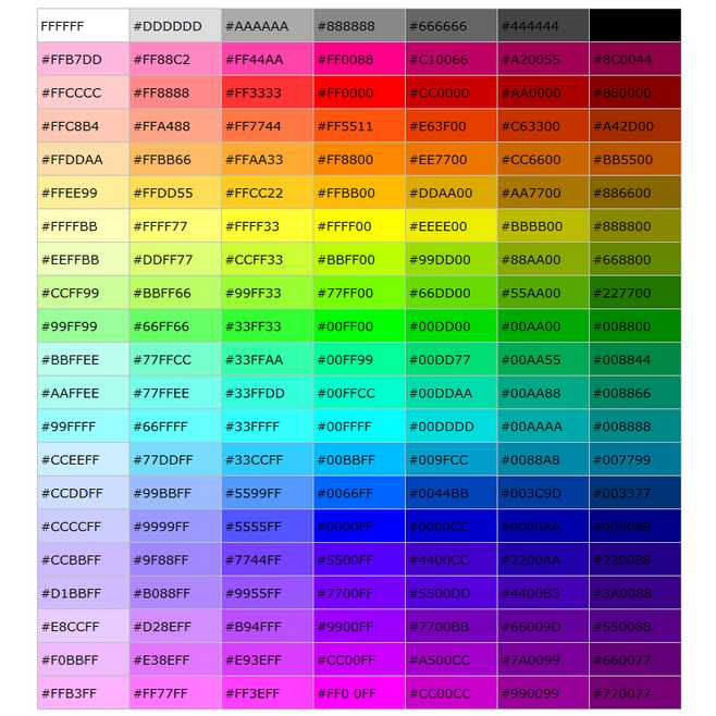 | Magenta | #FF00FF | 255, 0, 255 |
