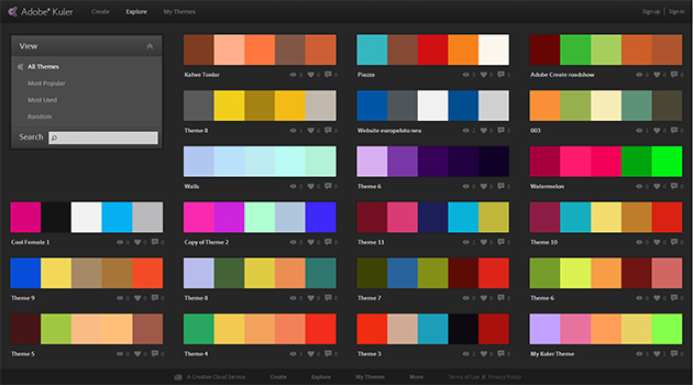 Выберите Исследовать и просматривайте тщательно подобранную ленту цветовых тем сообщества, Behance и Adobe Stock или адаптируйте свое путешествие, выполнив поиск по названию, тегам, цветам или шестнадцатеричным кодам.