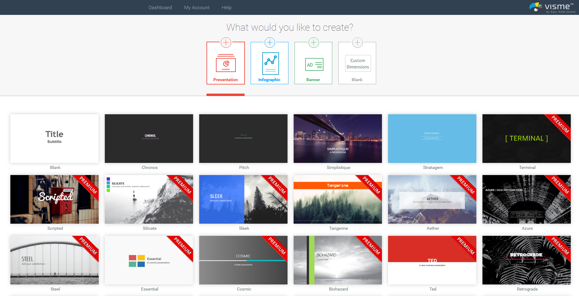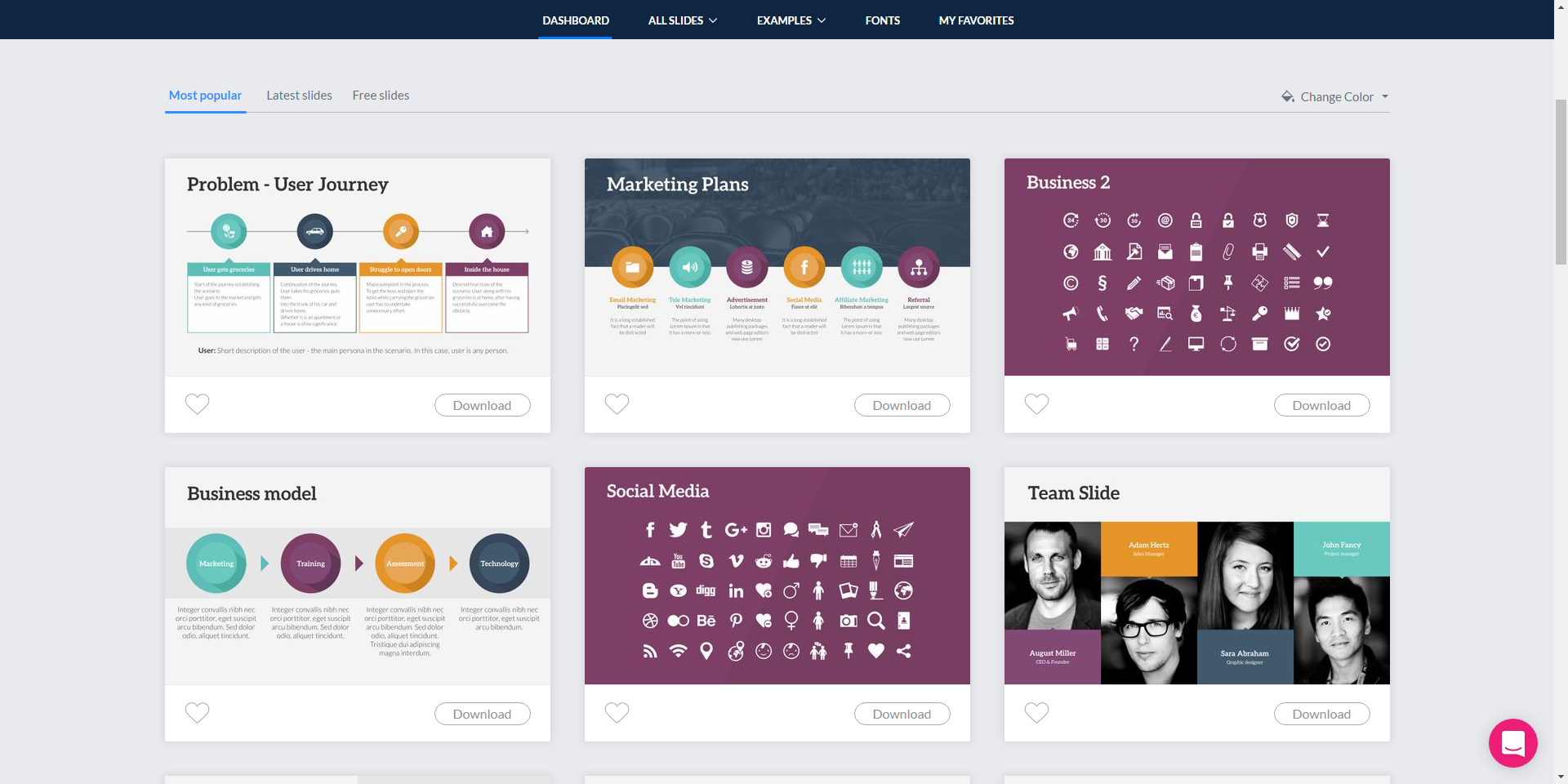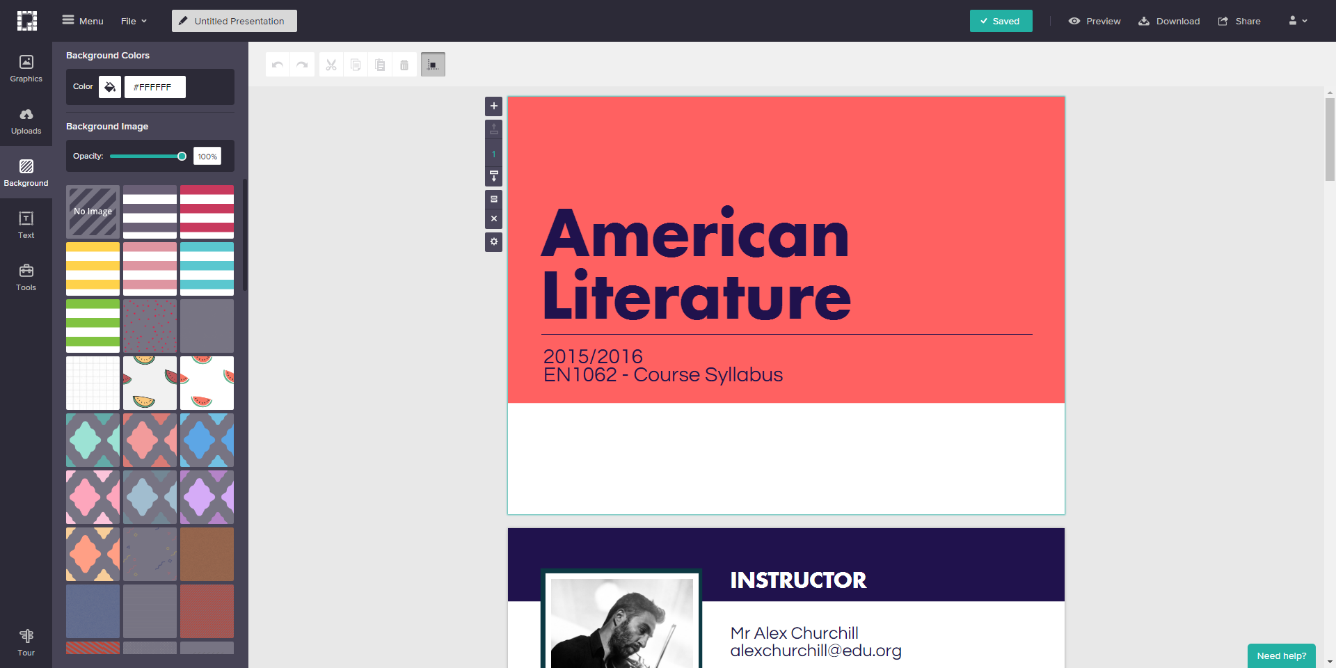 Пользователь может выбрать готовый шаблон или загрузить свой, добавлять инфографику, видео, менять цветовые схемы шаблонов.