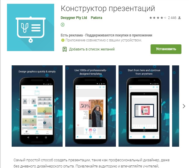 Бесплатный сервис для создания и редактирования презентаций. Можно использовать и онлайн и оффлайн, если приложение установлено на телефон. Есть готовые шаблоны для разных целей, можно создавать слайды и с нуля или на основе собственных изображений.