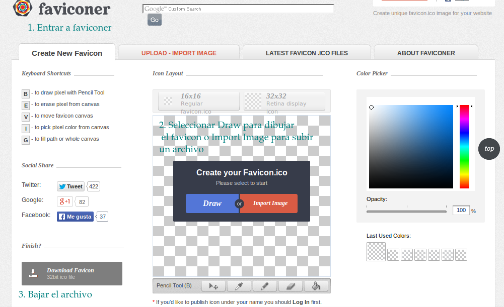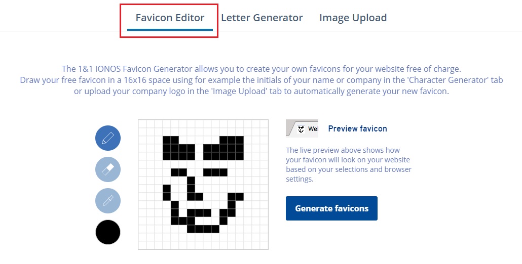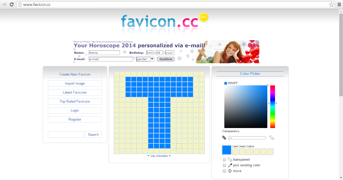 Favicon-generator.co  ΠΏΡΠ΅Π΄Π»Π°Π³Π°Π΅Ρ Π²Π°ΠΌ Π΄Π²Π° ΠΌΠ΅ΡΠΎΠ΄Π° ΡΠΎΠ·Π΄Π°Π½ΠΈΡ ΠΆΠ΅Π»Π°Π΅ΠΌΠΎΠ³ΠΎ Favicon. ΠΠ΅ΡΠ²ΡΠΉ ΠΌΠ΅ΡΠΎΠ΄ β ΡΡΠΎ ΡΠΎΠ·Π΄Π°Π½ΠΈΠ΅ ΡΠ°Π²ΠΈΠΊΠΎΠ½Π° ΠΏΠΎ ΠΈΠ·ΠΎΠ±ΡΠ°ΠΆΠ΅Π½ΠΈΡ, Π° Π΄ΡΡΠ³ΠΎΠΉ ΠΌΠ΅ΡΠΎΠ΄ β ΡΠΈΡΠΎΠ²Π°Π½ΠΈΠ΅ ΡΠ°Π²ΠΈΠΊΠΎΠ½Π° ΡΠ°ΠΌΠΎΠ³ΠΎ ΠΏΠΎ ΡΠ΅Π±Π΅. ΠΡΠ±Π΅ΡΠΈΡΠ΅ ΠΏΡΠΎΡΠ΅ΡΡ, ΠΊΠΎΡΠΎΡΡΠΉ Π²Ρ ΠΏΡΠ΅Π΄ΠΏΠΎΡΠΈΡΠ°Π΅ΡΠ΅. ΠΠ½ ΡΠΎΠ·Π΄Π°ΡΡ Favicon ΠΎΠ±ΡΡΠ½ΠΎΠ³ΠΎ ΡΠ°Π·ΠΌΠ΅ΡΠ° 16x16px. ΠΠ°Π³ΡΡΠ·ΠΈΡΠ΅ Favicon Π½Π° ΡΠ²ΠΎΠΉ ΠΊΠΎΠΌΠΏΡΡΡΠ΅Ρ ΠΈ ΠΏΠΎΠΌΠ΅ΡΡΠΈΡΠ΅ Π΅Π³ΠΎ Π² ΠΊΠΎΡΠ½Π΅Π²ΡΡ ΠΏΠ°ΠΏΠΊΡ Π²Π°ΡΠ΅Π³ΠΎ ΡΠ°ΠΉΡΠ°.