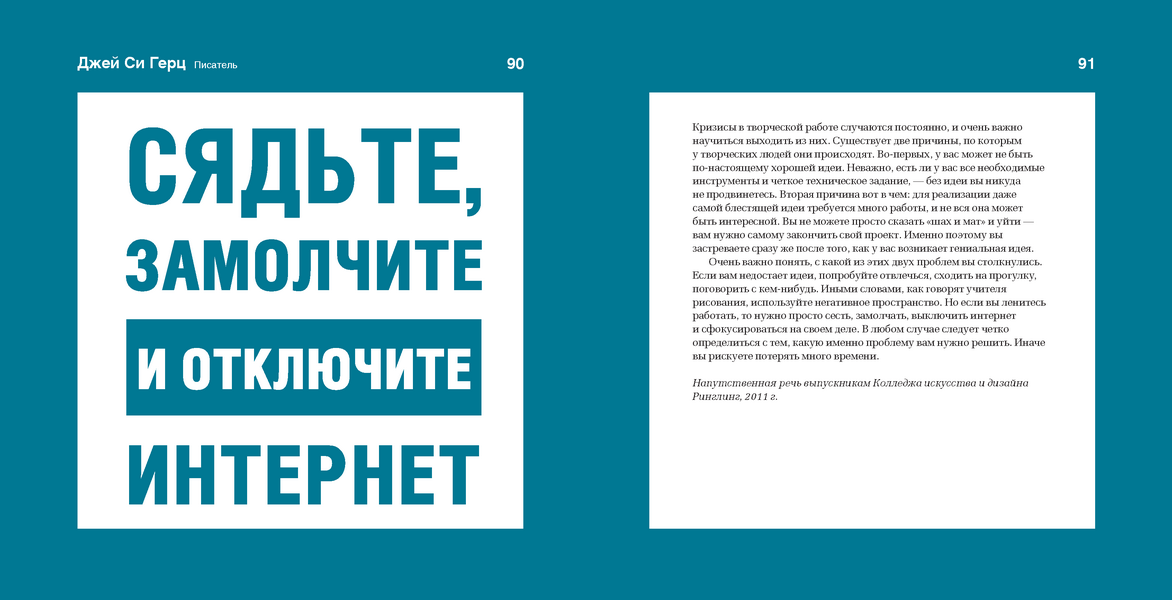 «Нам всем знакомо разочарование, которое возникает, когда мы сталкиваемся с творческим кризисом. Что ж, не стоит волноваться. Алекс Корнелл составил «90 проверенных стратегий преодоления творческого блока и разжигания воображения» из состав звездных креативщиков. Кристиан Хелмс, Александра Ланге, Дебби Миллман и другие делятся тем, что помогает им преодолеть трудности».